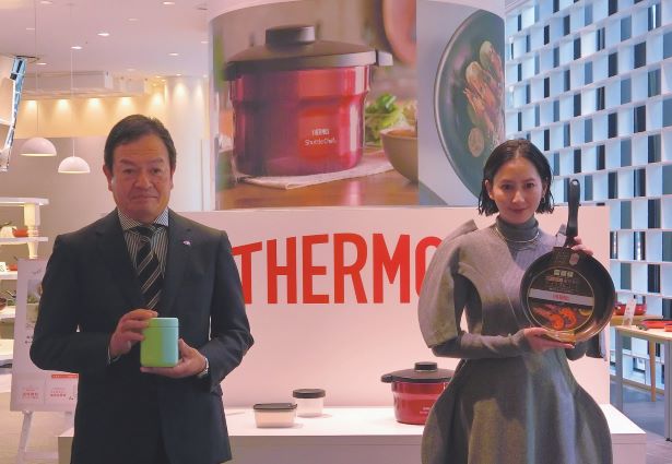 これに伴い16日に開催した発表会では、片岡有二社長が「実際に製品を手に取っていただき、サーモスのものづくりへのこだわりを感じていただきたい」と挨拶。また、タレントの河北麻友子さんがフライパンとスープジャーを使った「保温調理」に挑戦。フライパンでトマトソースを炒め、乾燥ショートパスタとトマトソースをスープジャーに入れて完成すると、「簡単すぎて料理じゃないみたい(笑)。フライパンは深さがあるのでソースがこぼれることもなく、安心して使えます。パスタはソースを変えるだけでレシピも広がり楽しい」と語った。