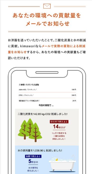 リユースが難しいアイテムは新たな商品の原料として活用するほか、サービス利用後には買い取ったアイテムをリユース、リサイクルしたことによる二酸化炭素と水の削減量といった環境貢献度合いを利用者にメールでフィードバックすることで、手軽に罪悪感なく商品を手放せるのと同時に、環境への貢献度も実感できる。