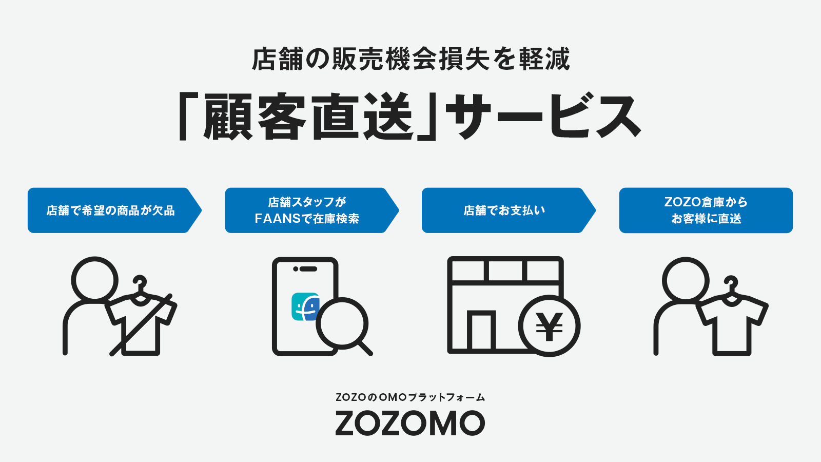 新サービスの「顧客直送」は、ブランド店舗スタッフの販売サポートツール「FAANS(ファーンズ)」を利用し、既存の店頭業務に組み込みやすいスマートフォンやタブレット端末上での簡単操作でゾゾベースの在庫確認から店頭決済、商品配送手配を完結することができ、販売機会ロスを防ぎながらプロパー価格での在庫消化をサポートする。