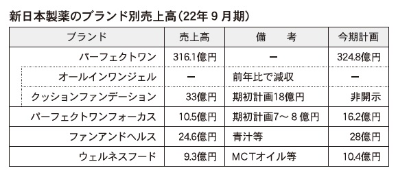 新日本製薬は、新規獲得商材として育成を図るクッションファンデーションが好調に推移する。前期(22年9月期)は、期初に商品単体で18億円の売り上げを計画していたが、33億円と大きく上振れた。若年層向け新スキンケアも育成が進む。