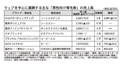 男性用育毛剤市場の競争が激化している。市場の拡大をけん引するのは、ファーマフーズ。コロナ禍のテレビ通販で認知を得た。成功を受けて、昨今は参入企業が増加。ウェブを中心に競争が激化する。EC市場は、ソーシャルテックが広告投資を強化しており、新規獲得が好調に推移する。