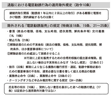 顧客と継続的な関係構築を念頭に置く通販と、これら商法は異なる。このため規制導入の際、勧誘前1年以内に2回以上の取引のある顧客を対象にした電話勧誘は、規制の適用除外が規定された。