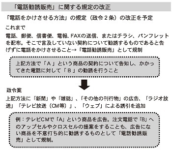 電話勧誘販売は、企業が電話をかけることにより行う方法、広告等により「電話をかけさせる」場合の違反行為を規定する。改正を行うのは後者。これまでも郵便やチラシで販売する商品を告知して誘引し、注文時に別の商品を勧誘した場合、電話勧誘販売として規制を受けていた。改正案は、これに新聞や雑誌、ラジオ放送、テレビ放送、ウェブを加える。