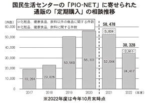通販の定期購入に関する相談は、高水準で推移する。国民生活センターが運用する「PIO―NET」に寄せられる相談件数は年間5~6万件ペース。今年度は、10月末時点で3万8328件に上り、例年と同水準で推移する。