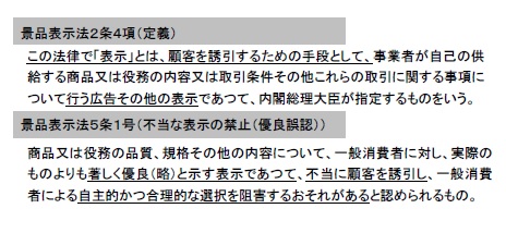 消費者庁は、これに「(表示)でなければ認定しない」とする。5条1項「優良誤認」は、「著しく優良と示す表示であって↓不当に顧客を誘引し↓消費者の合理的な選択を阻害する」と規定されており、不当表示であることが「主」、顧客誘引性が「従」の関係。「誤認が生じるものであれば、不当に顧客誘引していると推認される」(表示対策課)とする。