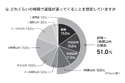 まず、「どのくらいの時間で返信が返ってくることを想定しているか」と聞いたところ、「即時~1時間以内」の合計は5割以上、「24時間以内」の合計は8割に上った(図参照)。次に、「対応品質による継続意向」について聞いたところ、対応への満足度が高い場合は「利用頻度が上がった」が30・7%だったのに対し、不満の残る対応後は「利用頻度が下がった」(34・0%)、「利用しなくなった」(31・9%)が、合計で約7割となった。同社では、問い合わせは顧客との重要な接点であり、その対応においては、品質とスピーディーさの両方が求められるとしている。
