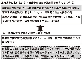 運用基準は、第三者への「商品提供」を例にこれを説明する。ただ、第三者の自主的な意思と認められないものとして、「商品等の無償提供の結果、事業者の目的に沿う表示を行う」ことを例示する一方、第三者の自主的な意思と認められる例として、「不特定、特定の第三者に試供品配布の結果、自主的な意思に基づき表示を行う場合」を示す。事業者からは、「読みにくく、具体的にどのようなケースが問題か分かりにくい」、「自主的な意思の客観的評価を厳密にできるものなのか。消費者庁の主導、担当者の裁量で、いかようにも判断できてしまう」などの声がある。