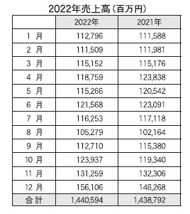 日本通信販売協会(=JADMA)の売上高月次調査集計によると、対象約120社の2022年(1月~12月)の総売上高は前年比0・1%増の1兆4405億9400万円だった(表参照)。「衣料品」や「家庭用品」、「化粧品」、「通信教育・サービス」など様々な項目が減少したが、「食料品」全体や「文具事務用品」などがプラスとなったことで対前年比では微増となった。