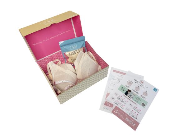 発送の際は、試着用サンプルブラと一緒に、パッド、メジャー、フィッティングエチケットシートなどが入ったボックスで届ける(画像)。