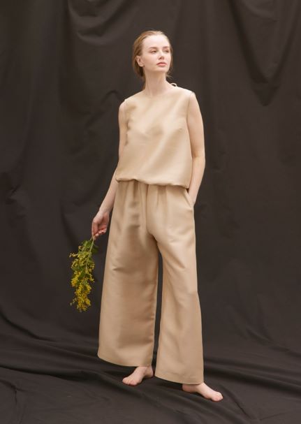 春夏ではオクタダブルクロスを使用した立体ジレ(税込4万7300円)とワイドパンツ(3万6300円=画像(上)、バックリボンブラウス(3万5200円=画像(下))などを展開。ジレはすとんと着てラフに、共布ベルトを結ぶとレディーに、セットアップでシックにと、素材ならではの立体感でメリハリのあるスタイルができるという。