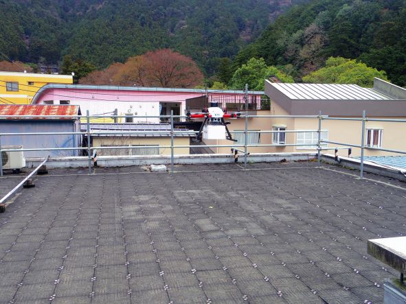 奥多摩郵便局屋上を飛び立ったドローンは、上昇後目的地となる山間地へ進み、操縦士がいる屋上から目視できない状態になったが、操縦士がパソコン画面で進行を確認し、配達先住居に到着。住人が荷物を受け取った。
