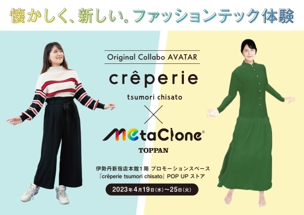 今回は、都内新宿の「伊勢丹新宿店」において、MetaCloneスタジオに登場するアバターを、スマートフォンアプリ「REV WORLDS(レヴワールズ)」を使って、仮想伊勢丹新宿店1階にポップアップストアとして開設する「クレプリ ツモリチサト × TOPPAN バーチャルショップ」に配置する。新ブランド「クレプリ ツモリチサト」の洋服を販売し、同ポップアップストア内に設置されたサイネージを通して、来場者自身のアバターがメタバース上のブランドの世界観に入り込み、試着などの体験ができるコンテンツ提供となる。開設期間は4月19日~同25日まで。