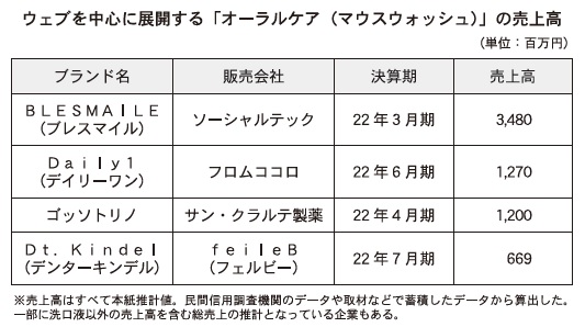 このほか、マウスウォッシュでは、フロムココロ(ブランド名・デイリーワン、以下同)、フューメント(ノッシュ)、ハハハラボ(キラハクレンズ)、グロリアス製薬(キヨラブレス)feileB(デンターキンデル)がしのぎを削る。