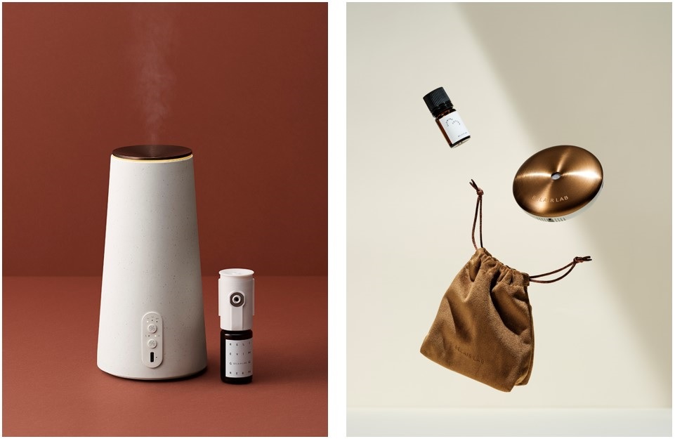 主力商品は2種のアロマディフューザー。21年6月に販売開始した「ナチュラル アロマディフューザー」(税込1万3200円)は、香りの再現性と拡散力に優れ、操作が簡単で手入れが不要などの機能性と、陶器とメタルカバーを組み合わせたモダンなフォルムが特徴(写真下(左))という。