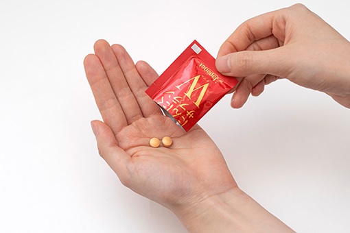 同商品は健康補助食品GMP認定を持つ委託先の工場で製造。1日2粒を目安に接種。2粒分を個別包装とし、必要な分だけ持ち運びやすく、また衛生的に摂取できるという。粒の大きさは直径8ミリと摘まみやすく飲みやすいサイズとした(=画像(下))。なお、商品は胃酸で溶けにくい特殊コーティングを施しており、にんにくの臭いを気にせず、時間や場所を問わず摂取できるという。
