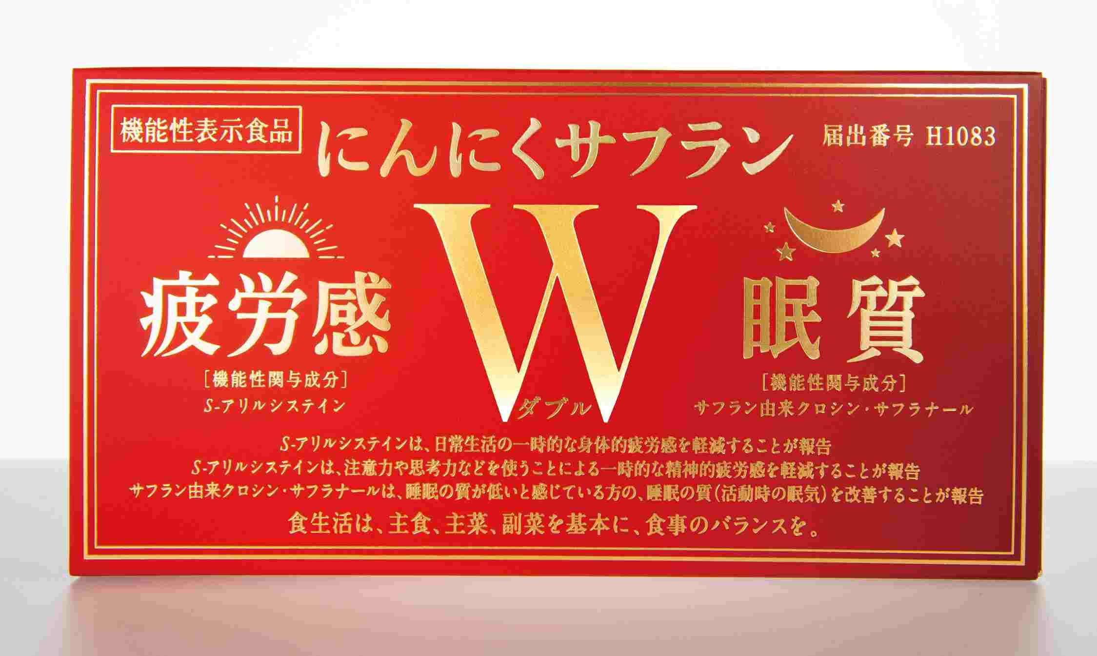 独自に開発・販売を開始した機能性表示食品「にんにくサフランW(ダブル)」(=画像(上))は機能性関与成分として配合している「S‐アリルシステイン」「サフラン由来クロシン」「サフラン由来サフラナール」によって、一時的な身体的、精神的な疲労感の軽減や睡眠の質(活動時の眠気)の改善を図れるなどと表示、日中を意欲的に過ごしたい人に訴求するとする。