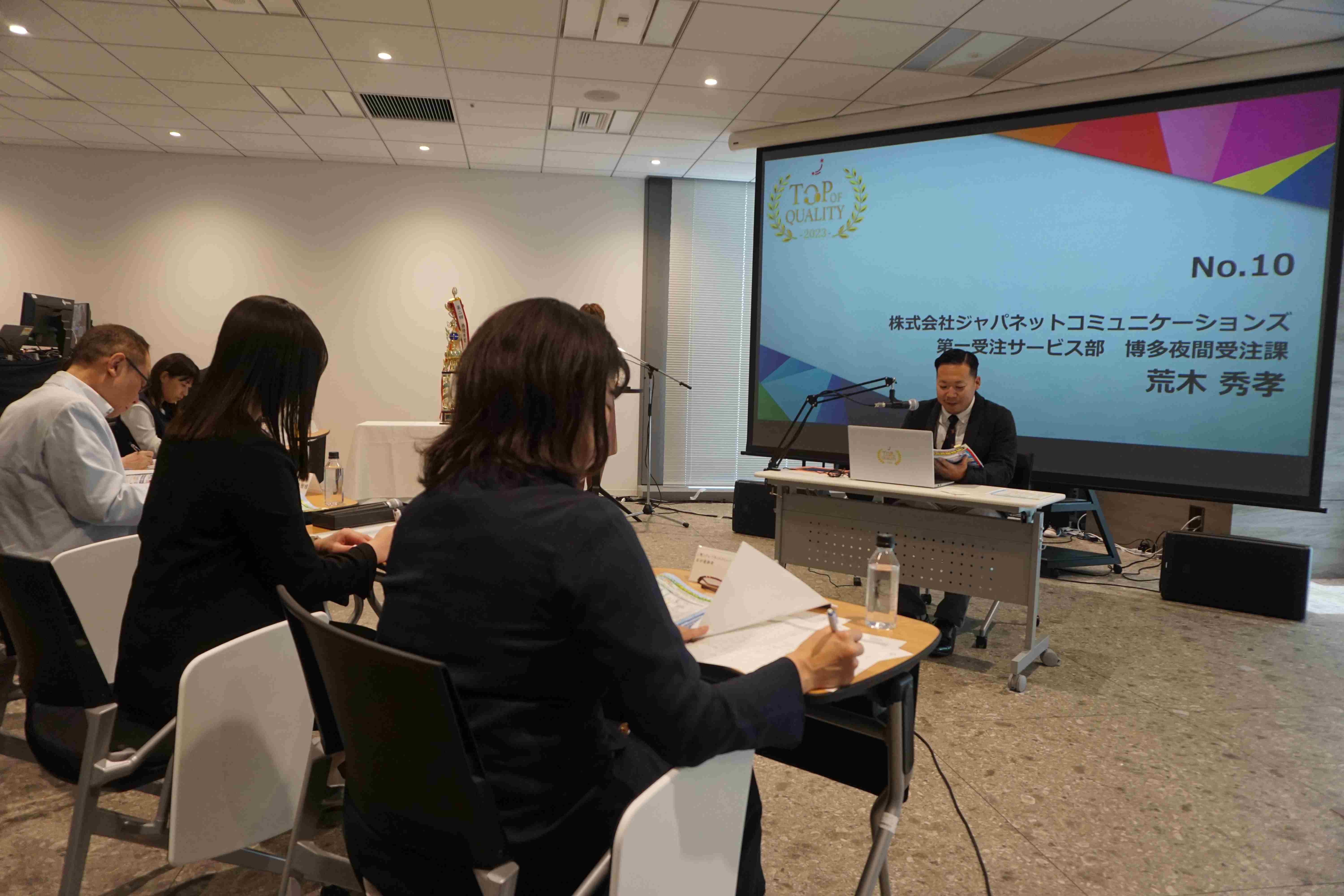 社内顧客応対コンクール「TOP of Quality」は同社コミュニケーターの電話応対のレベル向上などを目的に2019年からスタート。その年の一定期間の実際の顧客応対の内容から評価し、成績上位者十数人が本選に出場。その場で行う数分の疑似顧客応対を通じて、その質を社内外の審査員が評価して優秀者を決め、上位者にはジャパネットたかたで販売する食品や寝具などの賞品を贈与する。