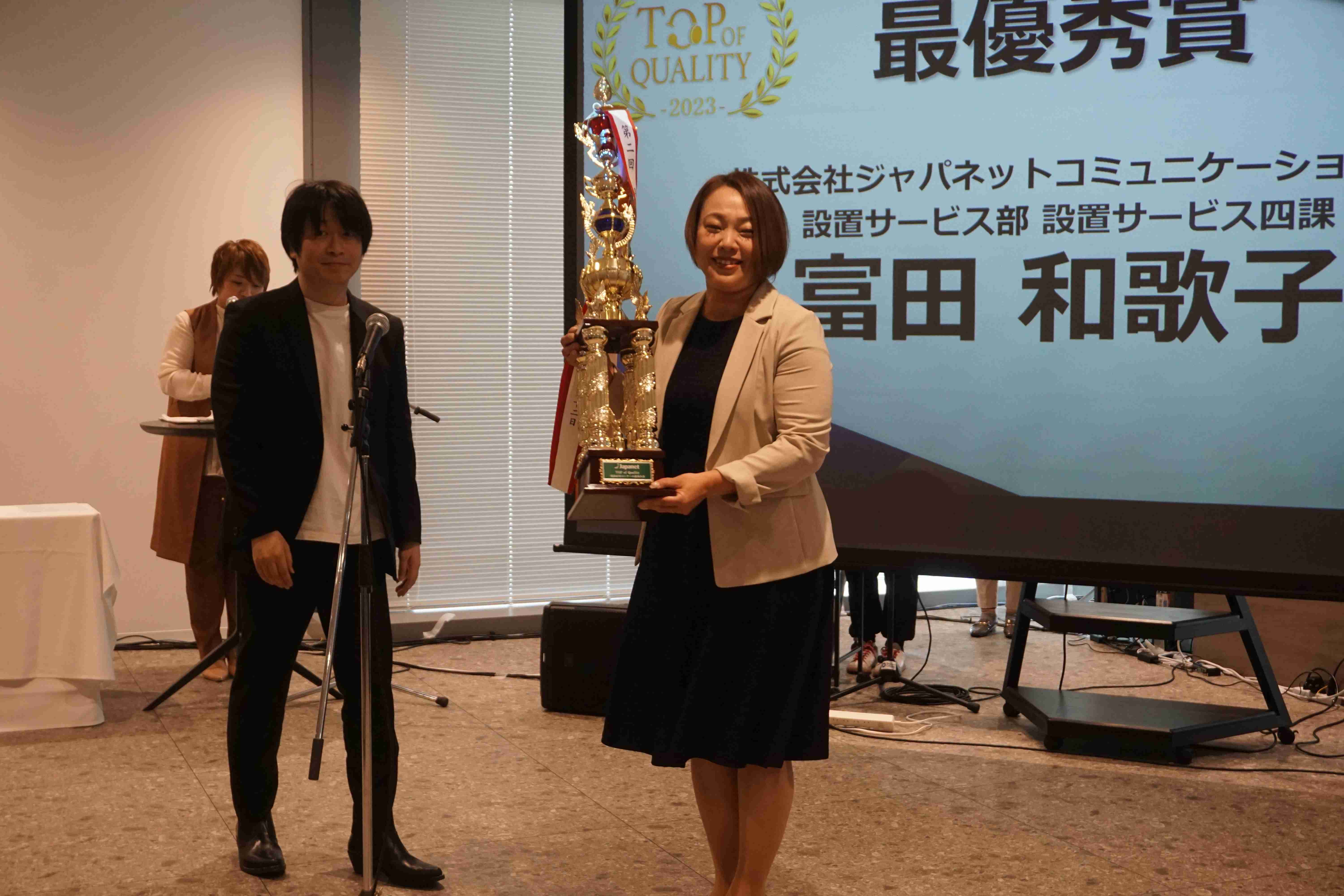 その結果、今回はジャパネットコミュニケーションズの設置サービス部設置サービス四課の富田和歌子さんが最優秀賞を受賞。ジャパネットが販売する豪華客船で日本各地を巡るクルーズ10日間の旅(ペア)の権利と副賞として所属課への打ち上げ代5万円が贈られた。最優秀賞を受賞した富田氏は「たくさんの人が紡いできた商品(のよさや特徴など)を最後の最後に全身全霊でお客様にお伝えすることが私たちの仕事。これからもジャパネットの応対は日本一だと誇れるよう皆で尽力していきたい」とした。