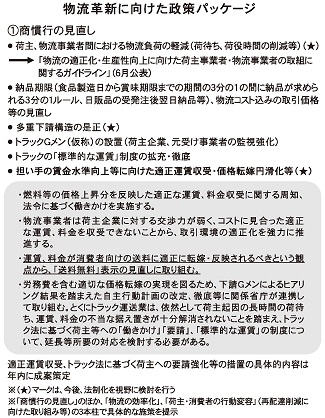 政策パッケージは、業界、分野別に、実態に即した自主行動計画の策定も求める。これには、「義務化ではなく促すもの。業界団体や複数社のグループによる取り組みを想定している」(国交省総合政策局物流政策課)とする。