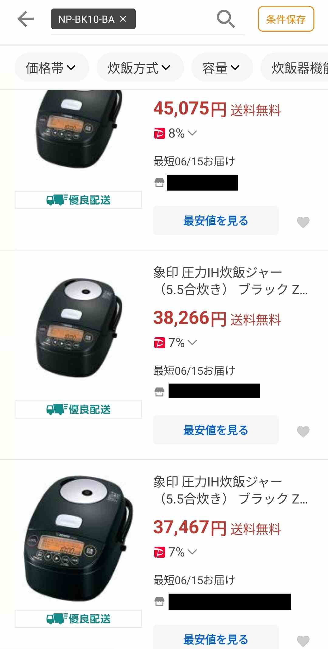 一方で、知名度が高くない店舗の販売する商品に「優良配送」マークが表示されることもある。例えば下画像の象印マホービンの炊飯器、ヤフーショッピングのアプリにおいて型番で検索すると、「優良配送」マーク付きで上位に出てくるのは知られていない店舗ばかり。同商品はアマゾンにおいて、2万7000円で販売されており、「楽天市場」のアプリでも最上位に表示されるのは約3万円の店舗(検索結果と価格はいずれも6月13日現在)。「優良配送」というだけで、他モールより2万円近くも高い店舗が最上位に表示されるのは不自然だ。これでは他モールに顧客が流れるのが当然で、ある業界関係者は「ヤフーは消費者にとって非常に買いにくいモールになっている」と指摘する。