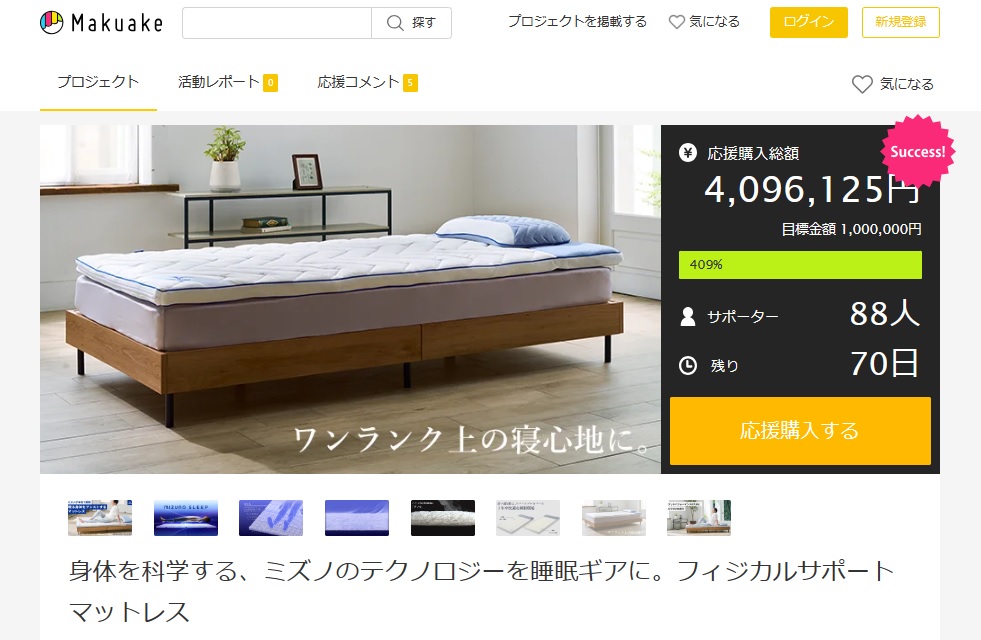 ミズノは6月14日、睡眠市場への本格参入に向けて新シリーズ「MIZUNO SLEEP(ミズノスリープ)」を立ち上げ、第1弾として高い体圧分散と寝返りのしやすさを実現したフィジカルサポートマットレス「ReFull(リフル)」と、睡眠中の熱を逃がす敷パッド「風道(フウドウ)」を応援サービス「マクアケ」で予約受注を開始した(