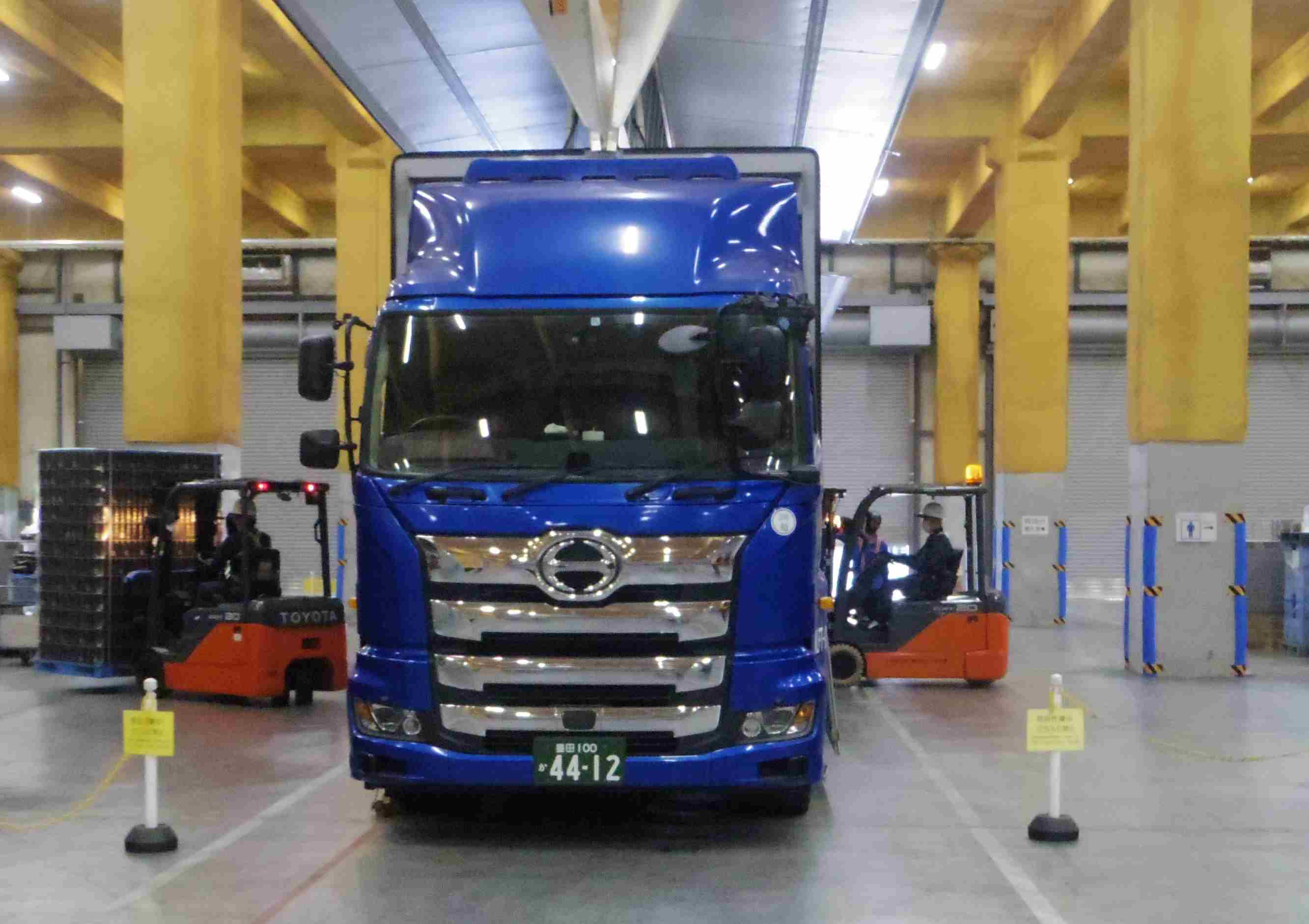 同社の物流拠点では、荷物の積み替えなどの荷役をドライバーが行わない。専用のスタッフがトラックの両サイドを開いて、フォークリフトで荷おろしし、そして別の荷物をフォークリフトで積んでいる。