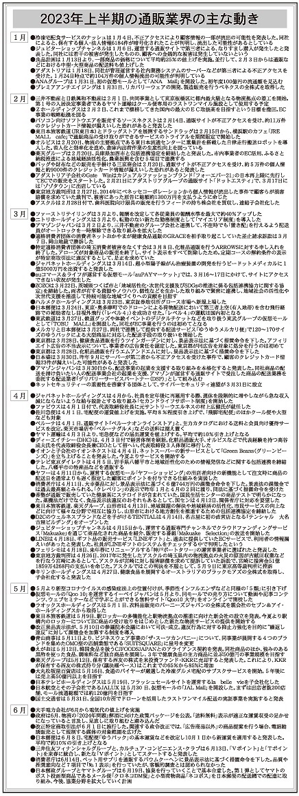 2023年も半年が経過し、早くも折り返し地点を迎えた。今年は新型コロナウイルスの感染症法上の位置付けが、季節性インフルエンザなどと同様の「5類」へと引き下げられた。また、通販周辺では生命線でもある物流費の値上げなど「2024年問題」を見据えた動きが急速に広まっている。昨年度とは大きな変化が見られるようになった今上半期において、通販業界で起きた主な出来事を振り返ってみる。