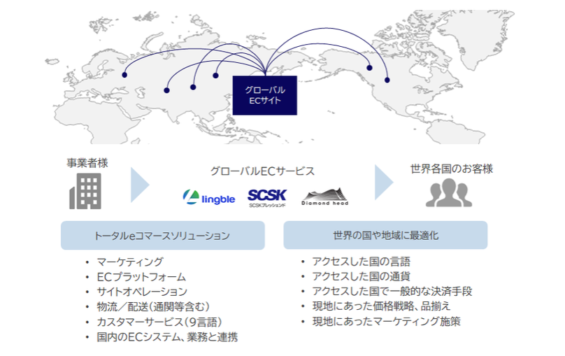 SCSKプレッシェンドとダイアモンドヘッドは従来から提供してきた国内向けのEC支援サービスに「リングブル」を組み込み、付加価値の高いサービスとして提供。グローバルコマースによる海外進出をサポートする。