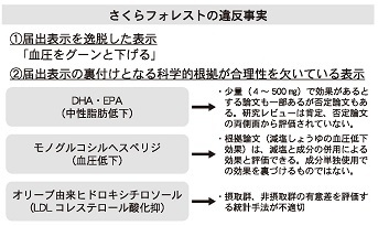 消費者庁の合理的根拠の提出要求(不実証広告規制)を受け、さくらフォレストは、DHA・EPAで30報を超える論文など根拠資料を提出。モノグルコシルヘスペリジンでは、トクホの許可論文も提出している。だが、消費者庁は、研究レビュー(SR)と届出表示の不一致を問題視。根拠と認めず「優良誤認」と判断した。