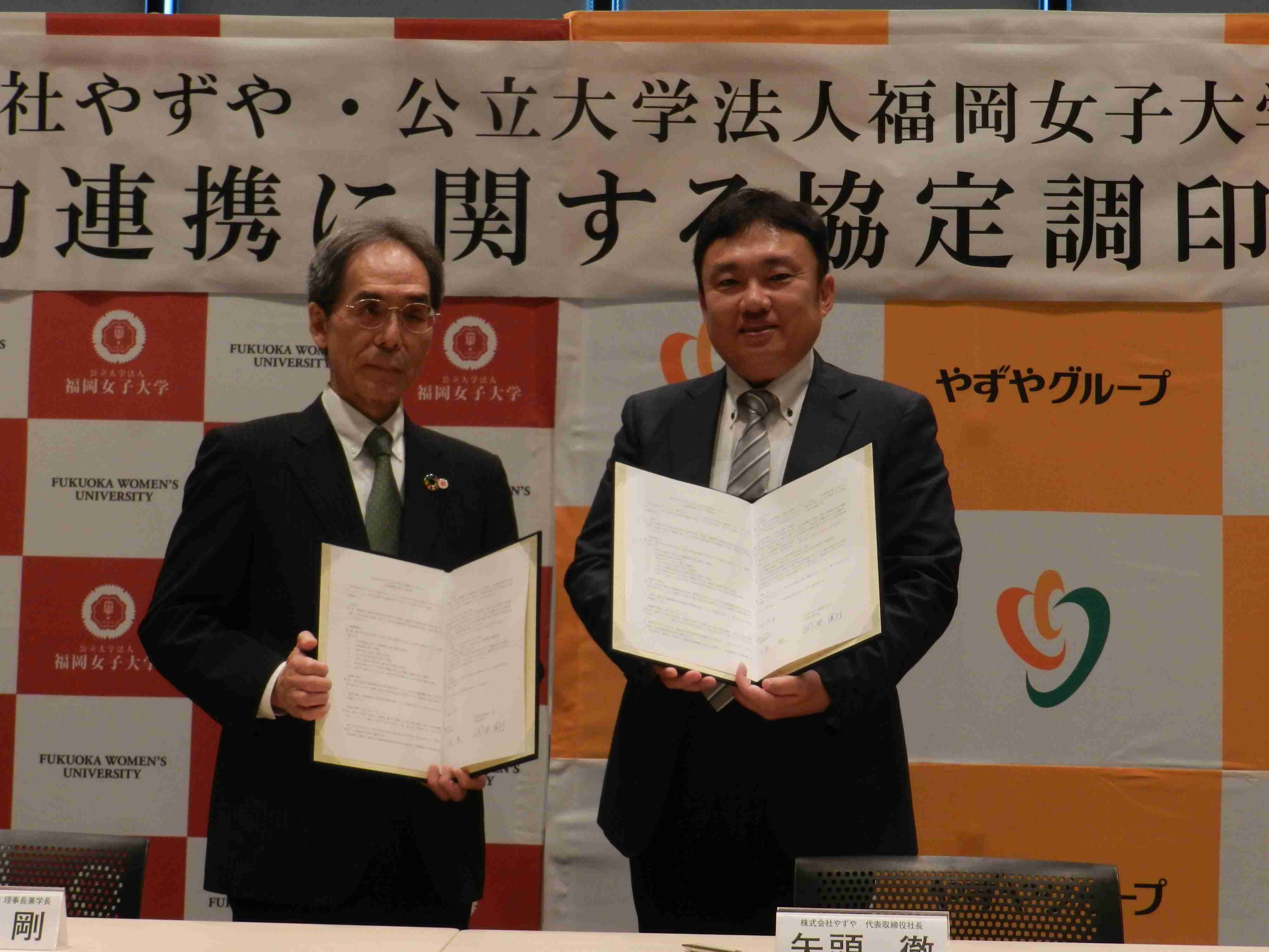 調印後の会見でやずやの矢頭徹社長は、「この街から発信する情報が多くの人の将来の健康につながれば」と話した。福岡女子大学の向井剛学長は、「古くから健康によいと思われるものは多く存在する。これをエビデンスをもって紹介できるのがアカデミアの得意とするところ。やずやの知恵・知見と、大学が持つ科学的な分析に関する知見を合わせることで、万人が納得できる研究成果が得られると思う」と期待を述べた。