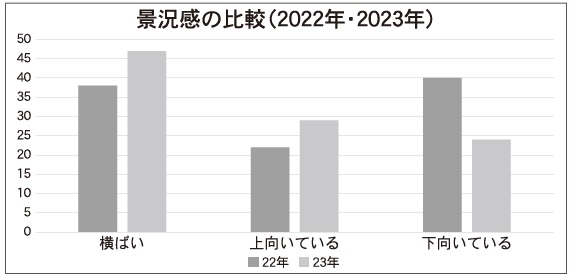 まず、2年連続で最多となった「横ばい」については前回は約4割(38%)だったが、今回は約5割(47%)へと拡大した。新型コロナの5類移行などによる旅行・レジャー関連の需要拡大や、リベンジ消費などの反動増が期待される一方、相次ぐ値上げや世界情勢の不安などのマイナス要因も根強く、景気全体としては拮抗するという見方が大半を占めたようだ。