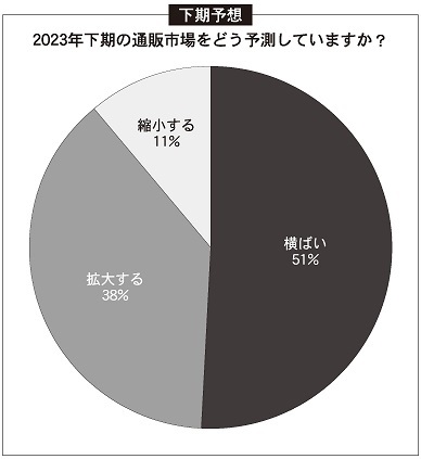 アンケートでは「2023年下期以降の通販市場」について質問し、「拡大する」「横ばい」「縮小する」の3択で回答してもらった。その結果、有効回答数のうち、「横ばい」と回答した企業は51%を占めた。「拡大する」は38%で「縮小する」は11%だった(