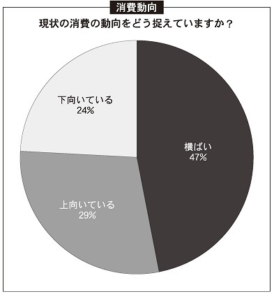 アンケートでは次に「現状の消費動向」について質問し、「上向いている」「下がっている」「横ばい」の3択で回答してもらった。その結果、最多は「横ばい」47%で、「上向いている」は29%、「下向いている」は24%となった(