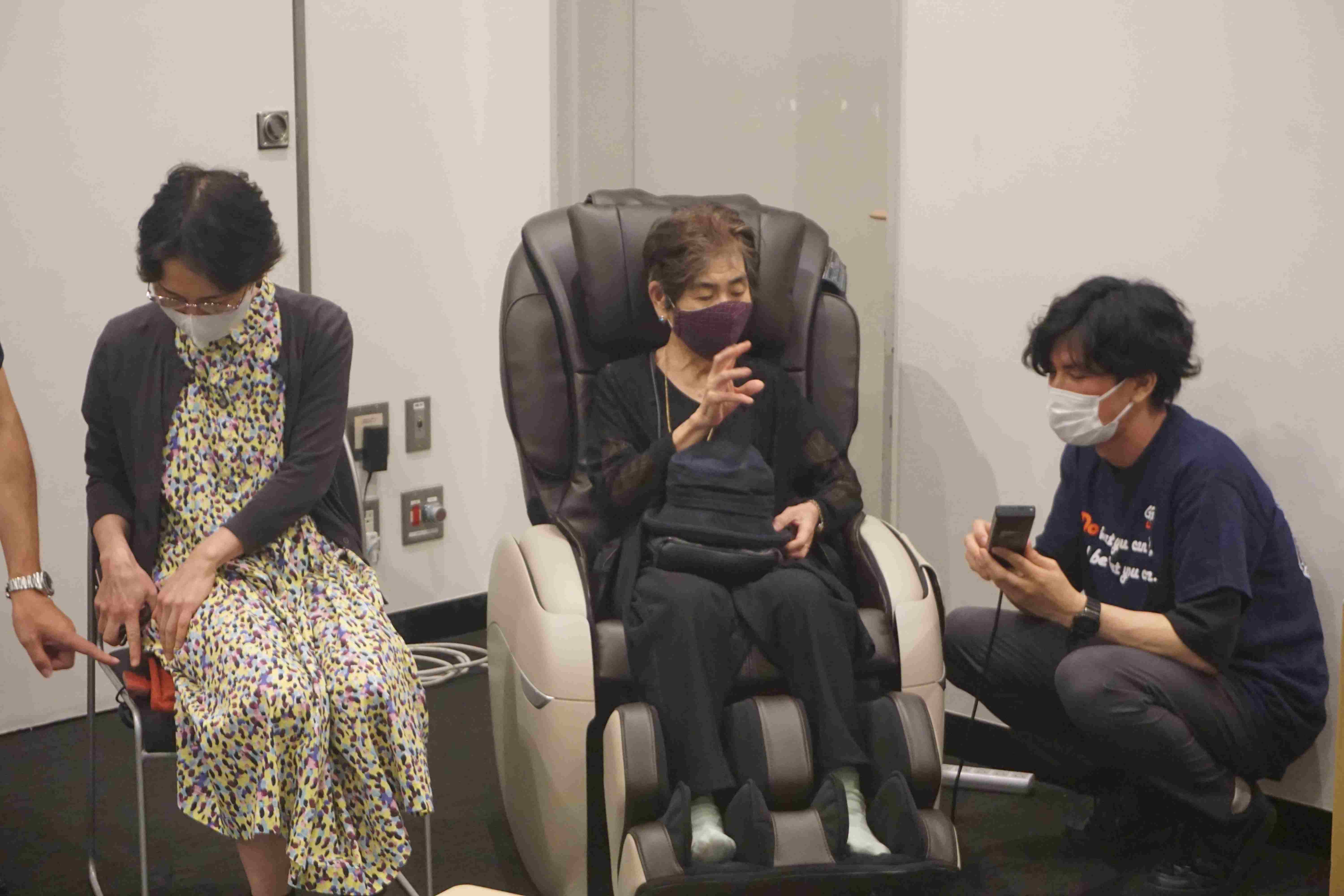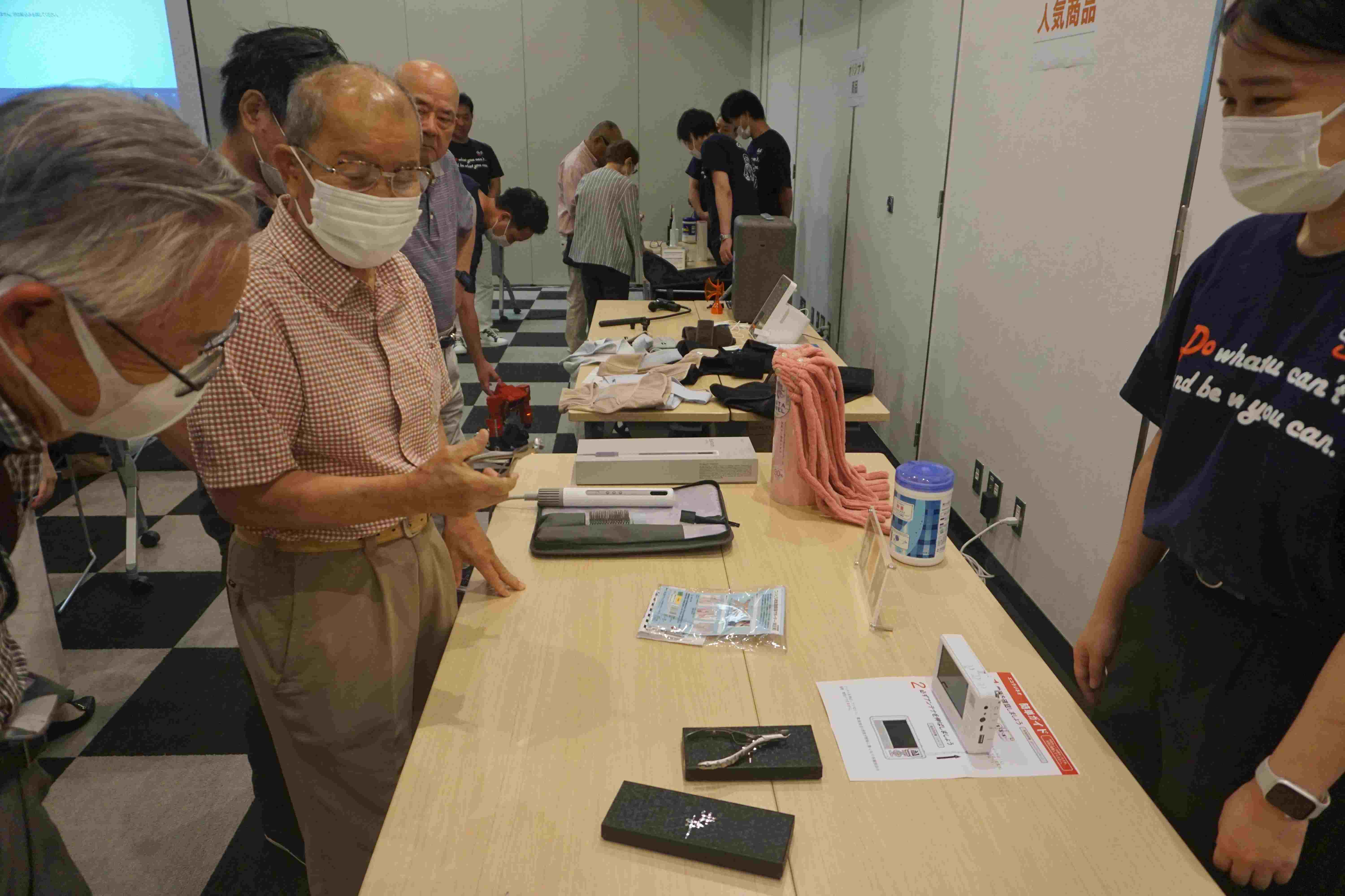 後半の商品体験会では5月に発売したマッサージチェア「フジ医療器マッサージチェアトラディS TR‐40」やひざ用サポーター「皮膚感覚ひざサポーターarukoプラス2枚組」、老眼鏡「プレスビー老眼鏡」などの新商品や「オムロン電気治療器」「EcoCa/エコカ マイカート ショッピングカート」といった定番の売れ筋商品、「電波振動歯ブラシ・プラジール2」や「健康青汁!筋骨プロテイン」などの同社オリジナル商品など約20商品を展示。参加した顧客は実際に気になる商品の使い勝手や使用感などを確かめ、「思っていたよりも軽くて着け心地がよい」などの声が聞かれた。