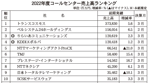通販新聞社はこのほど、コールセンター事業を手がける企業の2022年度売上高を調査した。上位35社の合計売上高は1兆3670億4200万円で、21年度比3・3%増加した。増収企業は35社の中24社で、新型コロナウイルス関連など公共系の業務の需要増という特殊要因もあり多くの企業が増収を果たした。一方で人手不足など課題が顕在化しつつある中で業務の効率化が求められており、りらいあコミュニケーションズとKDDIエボルバの経営統合に見られるように、今後は業界再編の動きが加速する可能性もありそうだ。(