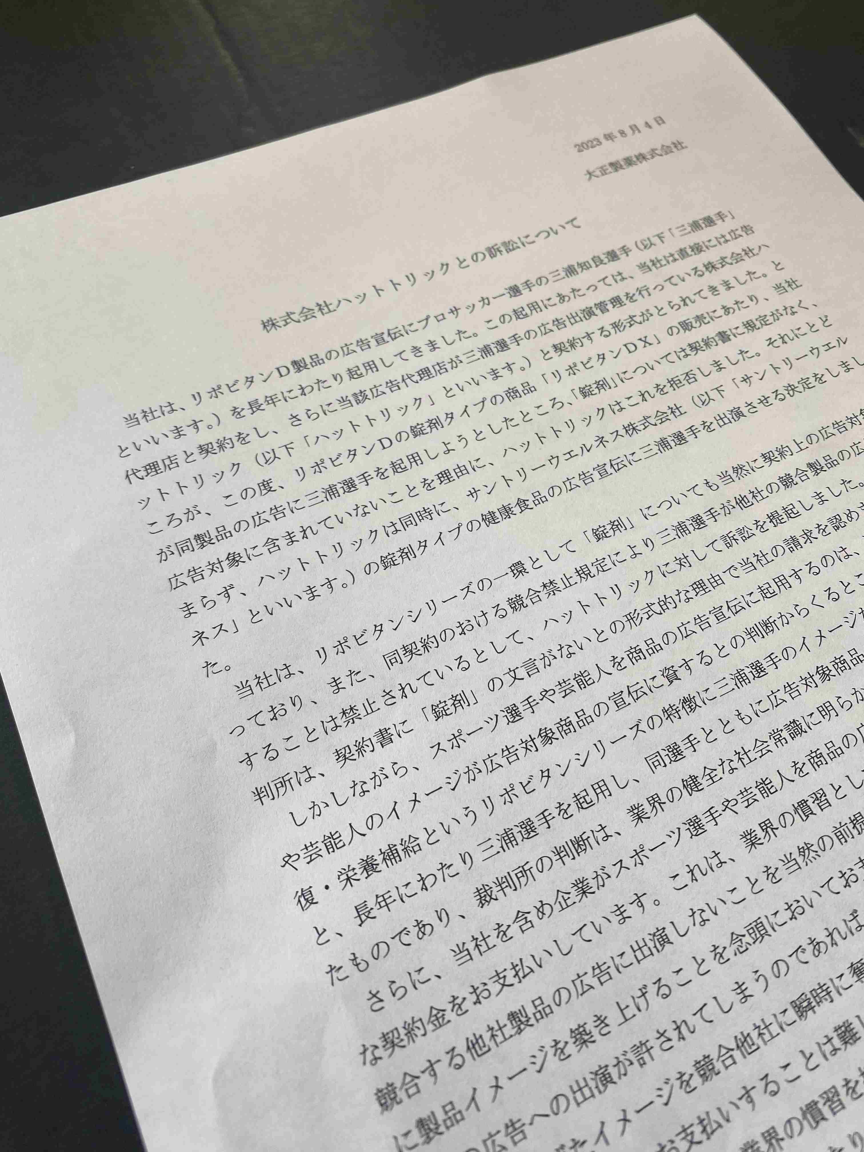 大正製薬は、訴訟で「錠剤」も「リポビタンDシリーズ」に含まれ、他社製品への出演は競合禁止規定に反すると主張。ただ、契約書に「錠剤」に言及した記載はなく、昨年12月、地裁は大正製薬の請求を棄却する。今年1月に控訴したが、高裁も7月、一審判決を容れる形で請求を棄却。これが”怒りの声明”につながる。
