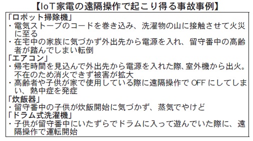 IoT家電の使用例として、外出先からのエアコンの電源操作がある。実は家電の火災原因にはエアコンの発火事故が少なくなく、自宅不在時にエアコンを作動させることは、万が一の火災発生時に初期対応ができないことになるため、メーカー側には安全に対するリスクアセスメントを求めている。