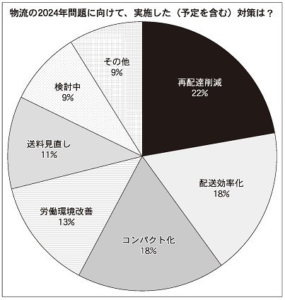 アンケートでは、2024年問題に向けて実施済み(または実施予定)の対策について複数回答で聞き、回答を集計・分類した。その結果、有効回答の中で最多だったのは「再配達削減」(22%)だった。次いで「配送効率化」(18%)、「コンパクト化」(18%)が同数で並び、同時に複数の対策を講じている様子が窺える結果となった。(図参照)