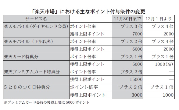 同社のポイント制度は、通常ポイントとなる1倍(税別購入額の1%)に、各サービスを利用した際の特典分が加算される仕組みだ。ポイントアッププログラム(SPU)において、これまで楽天モバイル利用者は+3倍(楽天市場のダイヤモンド会員)、もしくは+2倍(それ以外)だった。12月からはモバイル回線契約者なら一律で+4倍となる。一方で、月間の獲得上限ポイントについては、ダイヤモンド会員は7000ポイント、それ以外は6000ポイントだったものを、一律で2000ポイントに引き下げる。