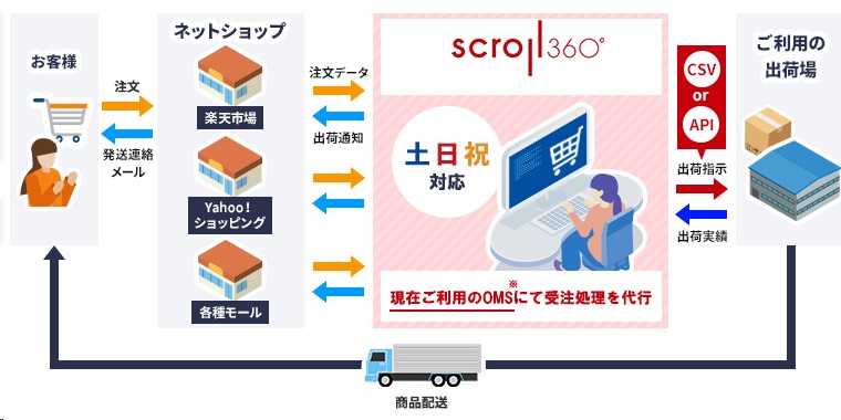 スクロール360の「土日祝対応プラン」では、自社リソースへ負担をかけることなく、土日祝日の出荷場連携が可能になる。EC企業が利用している受注管理システムにおいて、新たに専用アカウントを発行するというやり方だ。平日は今の運用のまま、土日祝日だけ同社に任せることもできるため、低コストで試験運用したいといった要望にも応えられるという。
