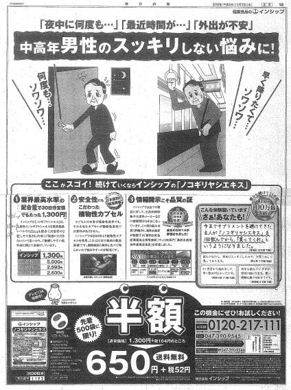 インシップは、ノコギリヤシエキス配合の健康食品について、「夜中に何度も…」、といった記載とともに、困った表情を浮かべ下半身を震わせる寝間着を着た男性のイラストを広告で掲載していた。