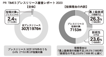 PR TIMESは2023年12月5日、「PR TIMESプレスリリース審査レポート2023」を発表した。それによると、全プレスリリースの2・4%にあたる7153件に審査指摘が入り、理由は「最上級表現の根拠不足」(全体の26・3%)が最多だった(