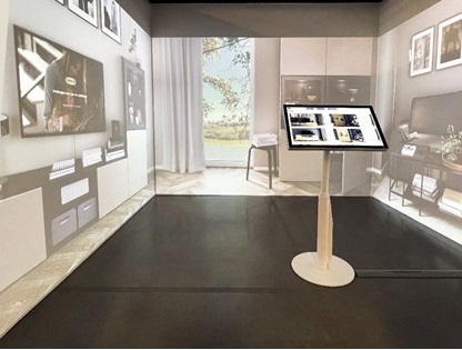 同ツールは、店舗の一角に用意された9平方メートルの室内を模した空間を使い、備え付けのデジタル画面を通じて操作ができるもの。ページをスクロールして気になったルームセットや商品をタップするだけで、用意された20のルームセットにある約2000のアイテムが、壁面などにバーチャル画像として映し出され、リアルなサイズを体感することができる。