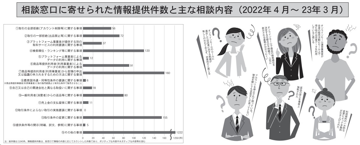 皆川「22年4月1日~23年3月31日の1年間に、オンラインモールの利用事業者向け窓口に寄せられた情報提供は合計2045件でした。この中身としては、ネガティブな内容だけでなく、ポジティブなものもあります」