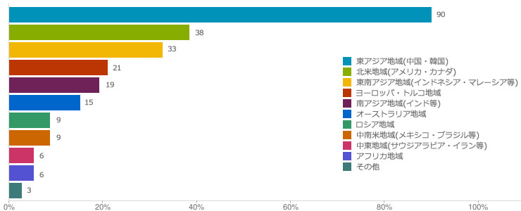 海外展開については、企業規模の大きさによって回答が大きく異なる結果に。「すでに行っている」と回答したのは、1000人以上の従業員の企業では78%にまでのぼる一方、50人未満の企業は10%程度に留まった。対象地域は中国・韓国など東アジアが90%と飛びぬけており、以下38%の北米、33%の東南アジアが続いた(表参照)。