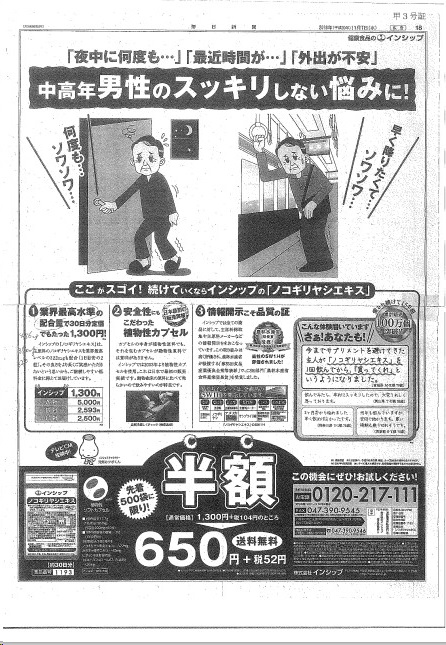 対象の広告は、インシップが展開するノコギリヤシエキス配合の健食の新聞広告(=