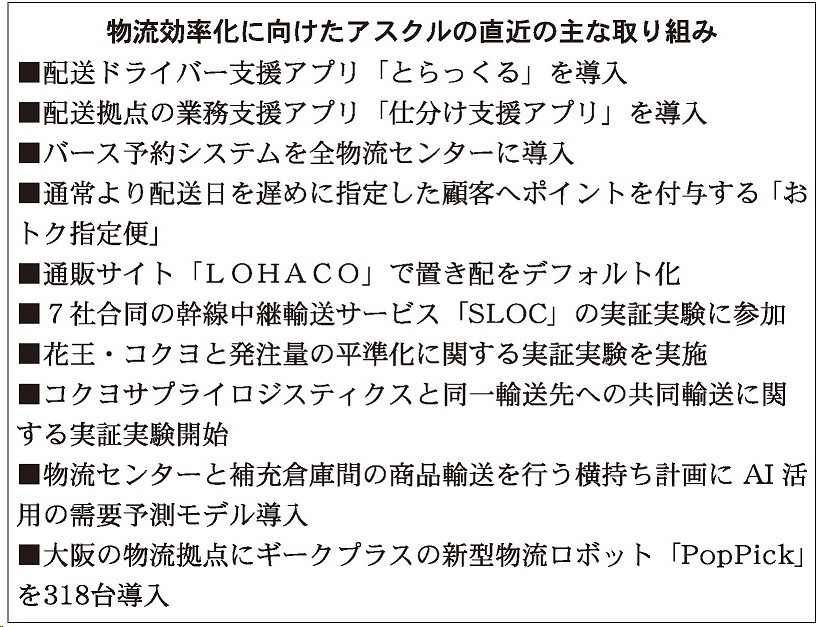 「とらっくる」は配送ドライバー向けにアスクルが独自開発した配送管理システムでドライバーは同システム搭載のスマートフォン端末を使って道路の混雑状況なども加味した配送ルート計画の作成や配送先に関する配送先の駐車スペースなどのナレッジ情報、日時変更や不在再配達依頼の情報確認などの配送業務に端末の操作で対応でき、配送業務の負荷軽減が図れるもの。この「とらっくる」を物流子会社の配送員だけでなく、アスクルが構築する自社配送ネットワークに参加して荷物のラストワンマイル配送を担う配送パートナー業者のドライバーにも20年9月から解放。さらに23年4月からはオープン化してアスクル以外の荷物の配送にもこのシステムの利用を認めた。狙いは「地場の中小運送会社が他社の荷物も効率的に配送できるようになり、アスクルの荷物もしっかりと運んでもらえるようになる」とアスクルで物流関連業務を統括する執行役員の成松岳志ロジスティクス本部長はいう。
