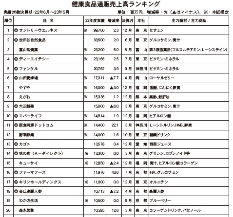 市場成長率、わずか0.1%増<22年度健康食品通販売上高ランキング> 機能性、表示規制強化で低迷、上位50社、6000億円突破も成長小幅