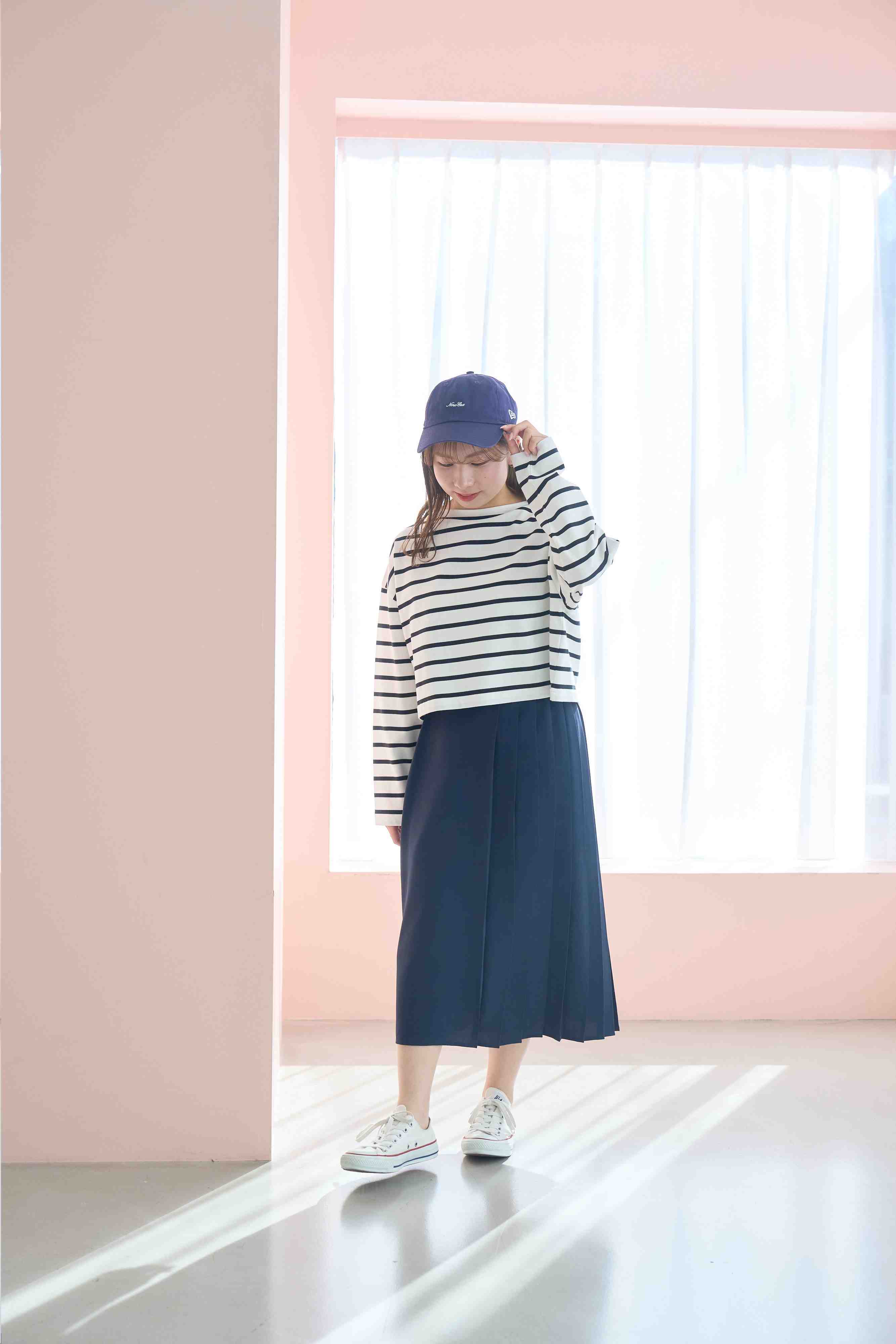 画像(左))は、一枚できちんと感のある着こなしができる商品で、スカートラインはサイドにだけプリーツ加工を施して軽やかに動きの出るデザインだ。