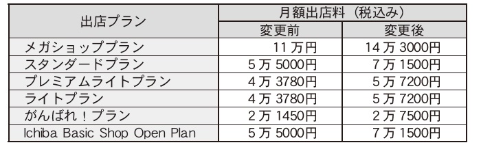 現行3プランについては「がんばれ! プラン」は月額2万1450円から2万7500円に、「スタンダードプラン」は同5万5000円から7万1500円に、「メガショッププラン」は月額11万円から14万3000円にそれぞれ値上げする。現在は申し込めない旧プランなどについては、「ライトプラン」は4万3780円から5万7200円に、「プレミアムライトプラン」は4万3780円から5万7200円に、「Ichiba Basic Shop Open Plan」は5万5000円から7万1500円に値上げする(料金はいずれも税込み)。